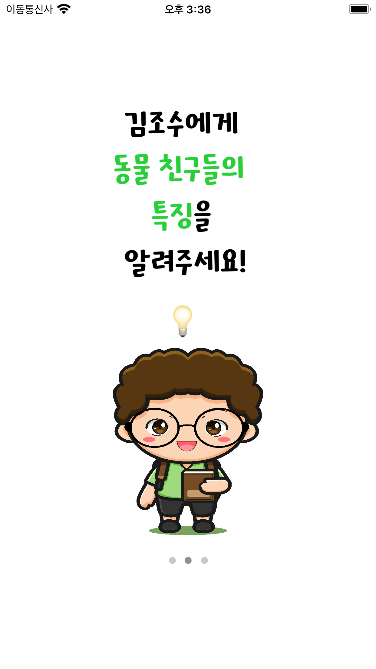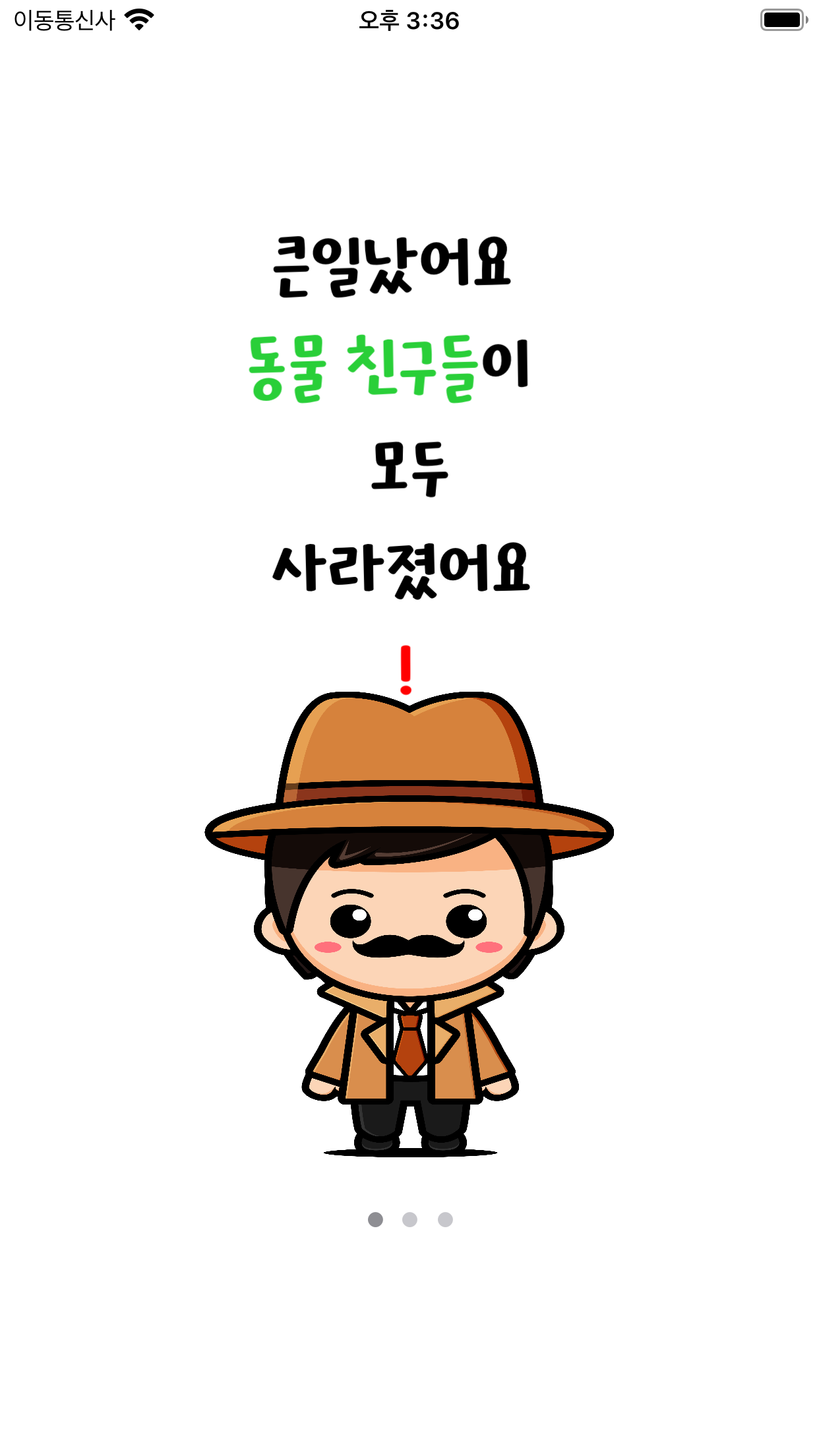 처음 앱실행이 되었을때 나타나는 화면으로, 유저들에게 유저스스로가 동물을찾는 탐정이라는 스토리를 제공해줌으로써 조금더 게임에 흥미를 느끼게 유도합니다
