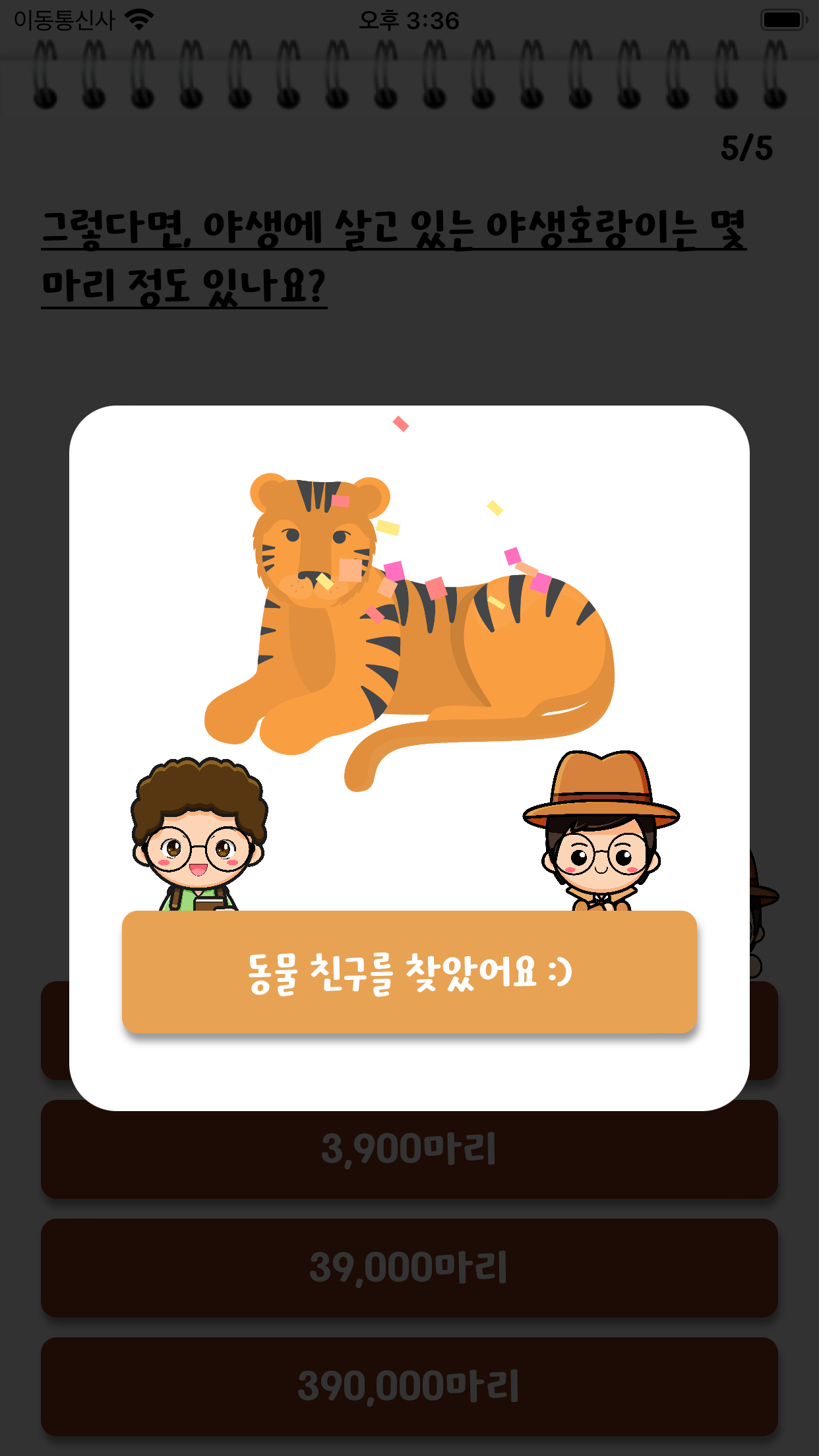 퀴즈를 모두 풀었을때 화면으로 퀴즈를 모두 풀었을 경우 동물친구를 찾았다는 버튼과 함께 해당동물에 이미지가나타나고 party popper을 통해 사용자를 축하해줌으로써 사용자가 성취감을 느끼게 유도해줍니다. 또한 동물 친구를 찾았어요 라는 버튼을 터치하게 되면 다시 메인으로 돌아가게 되면서 다른 퀴즈를 풀수있게 유도해줍니다